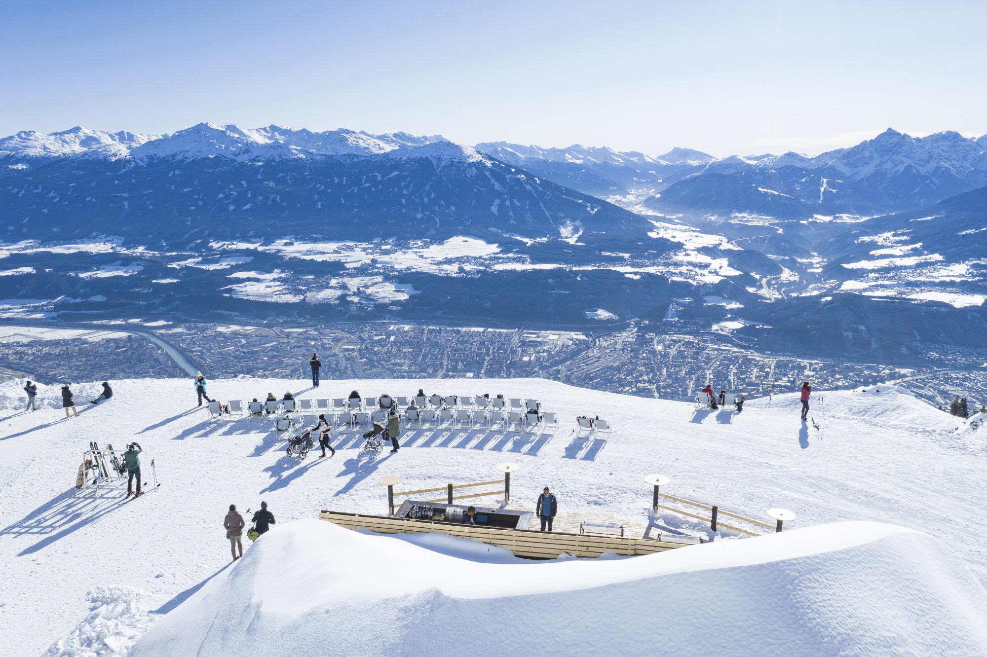 Das Skigebiet Nordkette ist besonders bei Tagesausflüglern aus Innsbruck beliebt. Die Nordkettenbahn transportiert euch direkt vom Innsbrucker Zentrum nach oben und dort könnt ihr mit Blick auf die Skyline die ersten Schwünge auf den Skiern versuchen. Eltern entspannen gern in den Sonnenstühlen auf 2.000 Metern Höhe mit Blick auf die Innsbrucker Skyline, während die Kinder die Kids Area Nordkette nutzen.