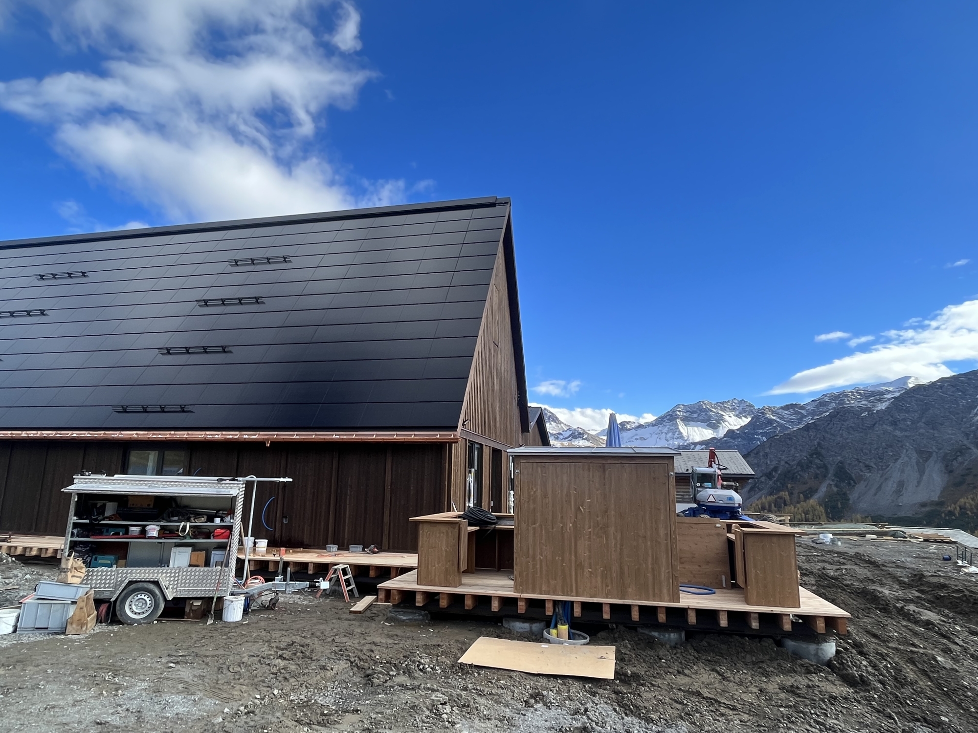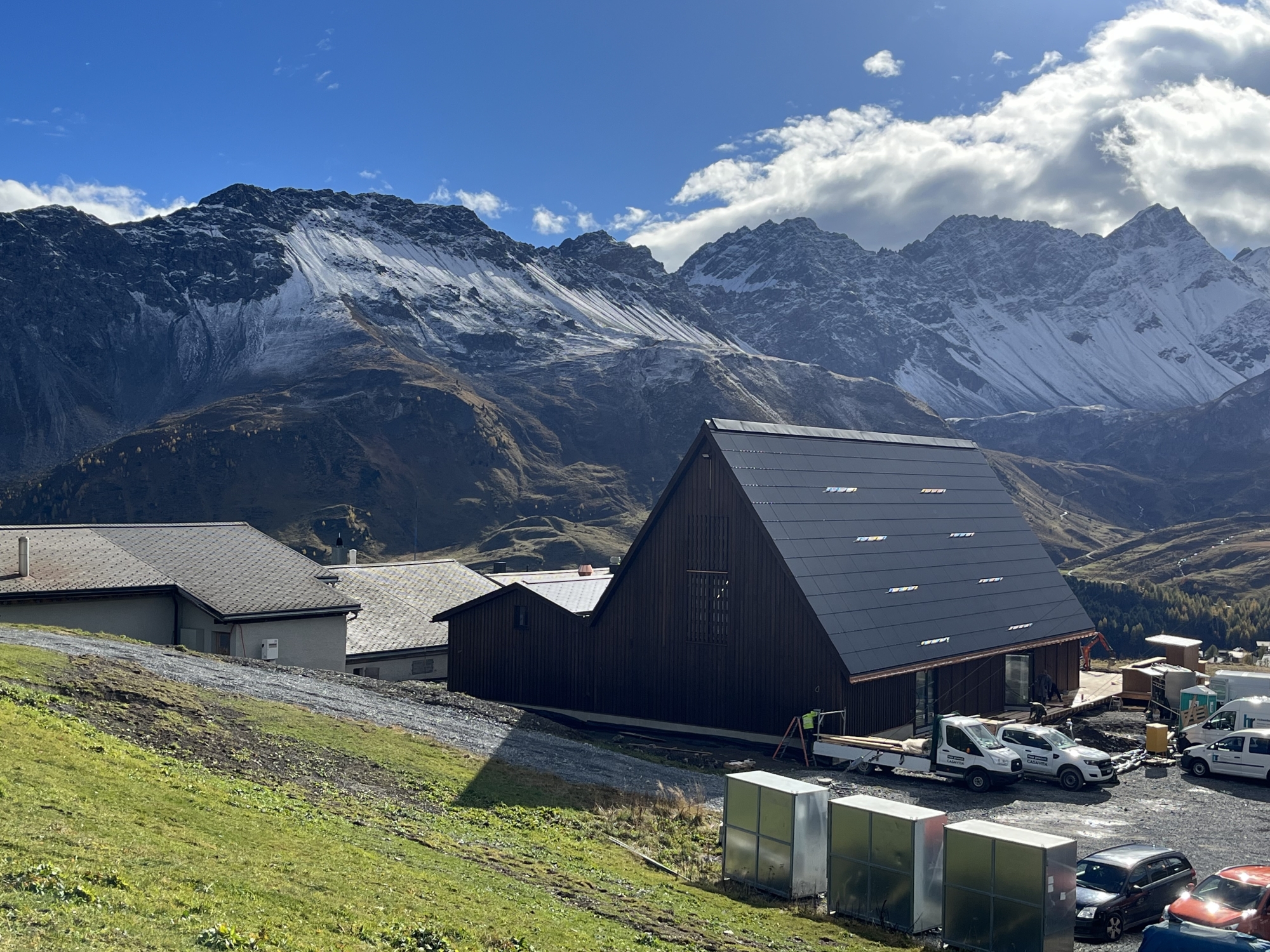 Die Anbindung der neuen KuhBar an die bestehende Blockhütte ist funktional als auch konstruktiv bewusst so gewählt. Der Einbezug der Raclettestube schafft Platz und Raum für einen großzügigen Barbereich mit Arbeitsflächen und Lagerraum. Der Mountain-Mac bleibt integriert, die Aussenbar lädt bei schönem Wetter zum Verweilen ein. Dieser Neubau ist wertbringend mit Blick auf den Gedanken der Nachhaltigkeit durch die prägnante Dachform mit integrierter Photovoltaikanlage (dunkle Paneele). Die Stromproduktion aus Sonnenenergie deckt nicht nur den Eigenbedarf ab, sondern 50% des gesamten Strombedarfs der Tschuggenhütte. Verarbeitet wird ausschließlich einheimisches Holz. Das Projekt integriert sich in den Kontext, bildet eine optische und räumliche Einheit mit dem Bestand. Bestehende Leitungen und ein Teil der Gebäudetechnik werden übernommen.