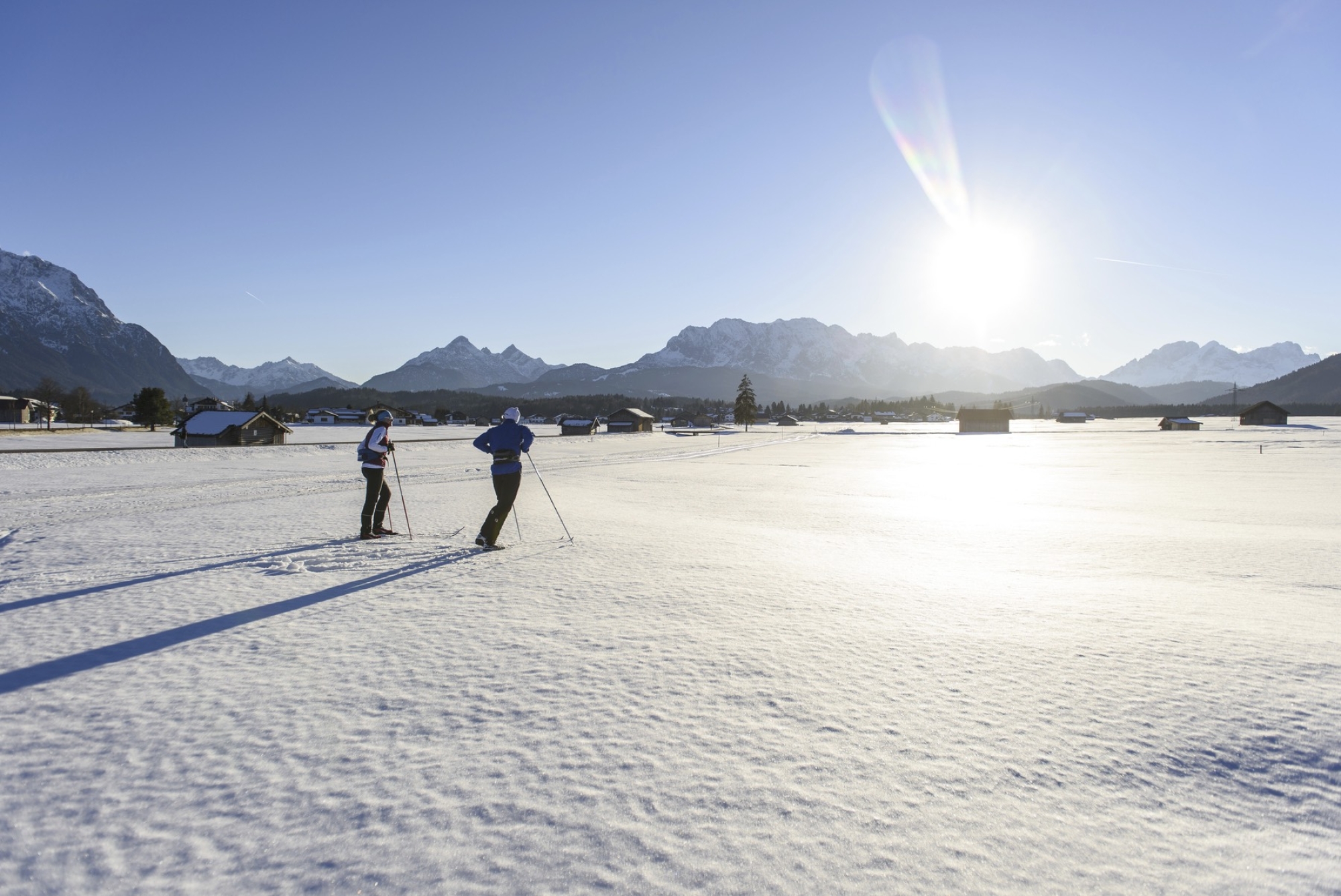 Mittenwald selbst liegt in einem sonnigen und – dank der Höhe von rund 900 Metern – auch sehr schneesicheren Hochtal am Fuß des Karwendels und bietet insbesondere Langlauf-Neueinsteigern und geruhsamen Skiwanderern ein ansprechendes Angebot. Ständiger Begleiter im höchstgelegenen, traditionsreichen Luftkurort Bayerns – ein malerischer, auch für seine Geigenbautradition bekannter Ort mit kleiner Fußgängerzone und schmucken Häusern – ist die Kulisse mit Karwendel und Wetterstein.