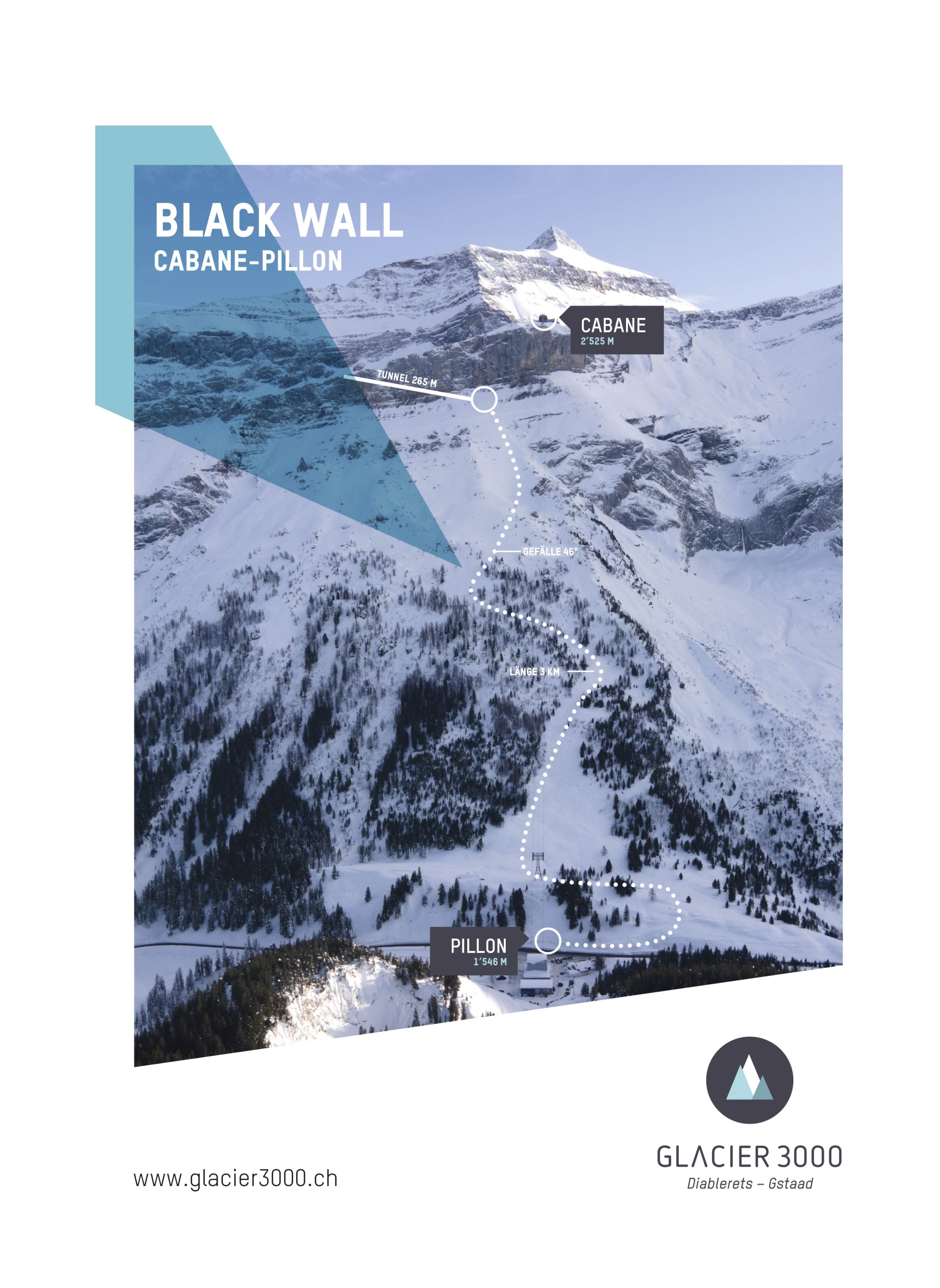 Eine Piste, die steiler als die Streif oder das Lauberhorn ist - das ist die neue Black Wall oberhalb des Dorfes Les Diablerets im Skigebiet Glacier 3000. Mit der Eröffnung der neuen Abfahrt besitzt das Gebiet nun eine der steilsten schwarzen Pisten der Welt. "Nur sehr gute Skifahrerinnen oder Skifahrer können diese Piste befahren mit ihren maximal 46°", erklärt Bernhard Tschannen, CEO von Glacier 3000. Die Präparierung der Piste ist eine Herausforderung für die Betreiber, die eine Pistenmaschine mit einer 1’400 m langen Seilwinde in der Felswand des Hangs platzieren mussten, um den oberen Teil der Piste präparieren zu können.