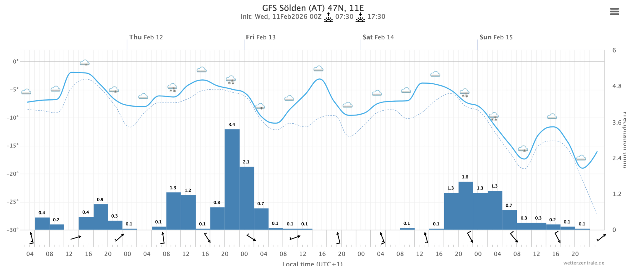 Meteogramm (GFS-Wettermodell, 10-Tage-Trend): Winterberg (GER), Sölden (AUT), Mayrhofen (AUT), Arosa (SUI)