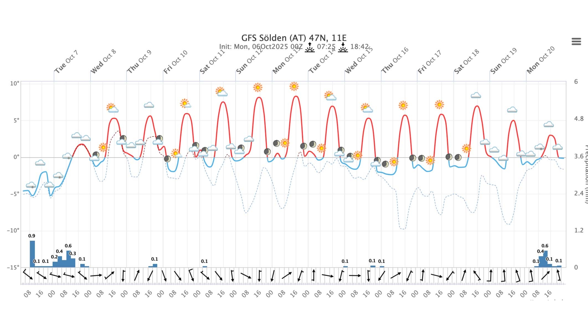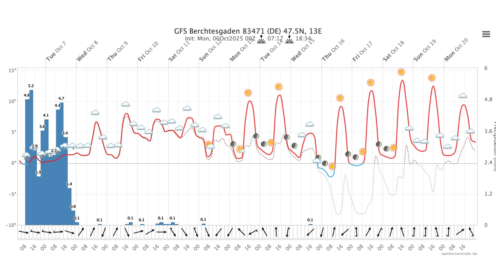 Nachdem sich die Berge in den Alpen in den letzten Tage oft weiß gefärbt haben, stehen zwar am Montag noch einige, zum Teil ergiebige Niederschläge und oft trübes Wetter an (insbesondere in den Ostalpen auf der Alpennordseite), doch der erste heftige Wintereinbruch dürfte damit dann erst einmal Geschichte sein. Am Dienstag gibt es noch trübes Wetter mit geringen Niederschlägen in den Nordalpen, die Temperaturen steigen wieder und bis zum Wochenende kann man wechselhaftes Wetter mit Wolken, Sonne und nur ganz vereinzelten Niederschlägen erwarten. Die Nullgradgrenze steigt bis Mitte der Woche wieder auf über 3000 Meter.