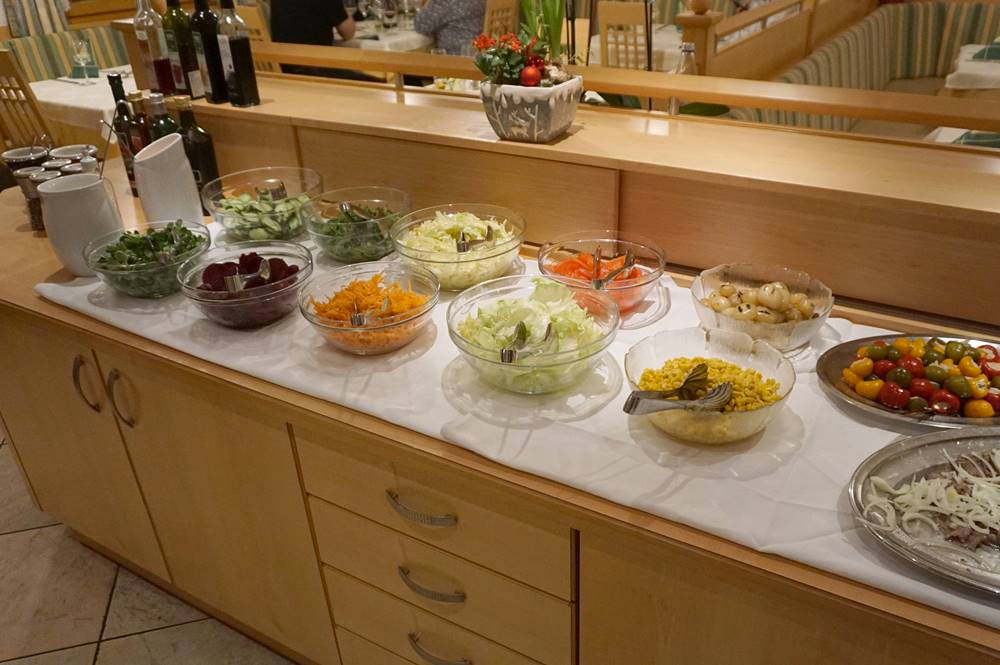 Zu essen gibt es immer fünf Gänge, zuerst einen selbst zusammengestellten Salat vom üppigen Salatbuffet, danach eine Suppe aus dem Topf, an dem man sich selbst bedienen kann. Der Zwischengang, in unserem Fall gebratene Ente auf Risotto, sieht köstlich aus. Bis jetzt ist das Essen sehr lecker und wir warten gespannt auf den Hauptgang. Wir können aus zwei verschiedenen Gerichten wählen, also nehmen wir einmal Zwiebelrostbraten mit Schupfnudeln und einmal gebratenen Lachs mit Petersilienkartoffeln. Unsere Bäuche sind schon längst voll, aber dem leckeren Nusshalbgefrorenen mit einem dekorativen Schmetterling aus Hippenteig können wir nicht widerstehen. Das Essen war wirklich köstlich und zur besseren Verdauung bringt Hotelchef Josef noch einen Schnaps. Danach müssen wir schnell ins Bett.