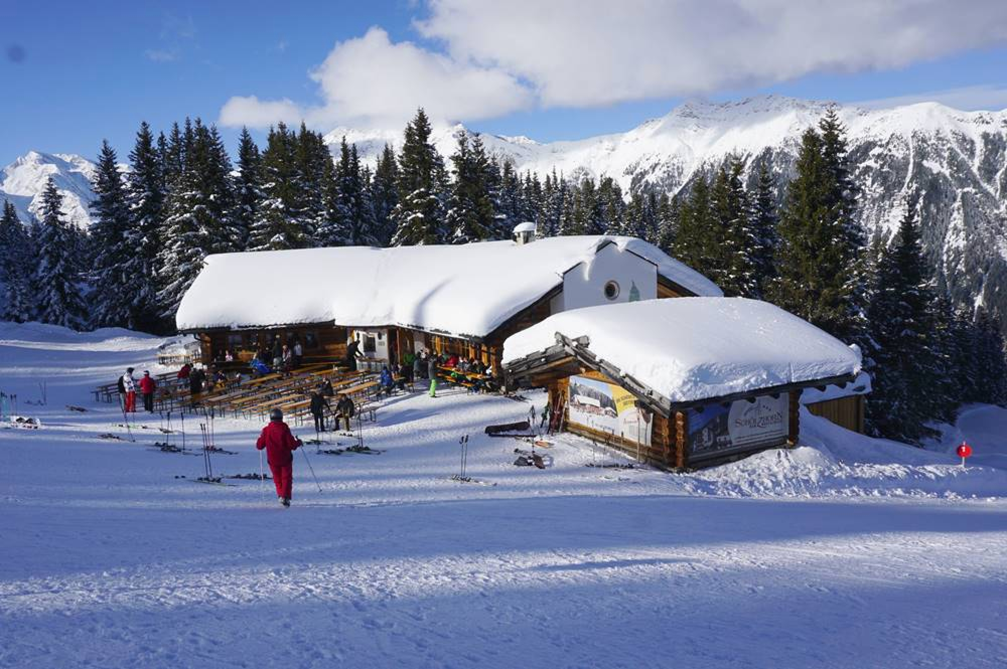 Nach einer Weile reißen wir uns los und wandern weiter. Immer wieder sehen wir von Weitem einen der Leitner-Lifte. Manchmal kommen uns andere Wanderer und Langläufer entgegen. Wahrlich ein schönes Fleckchen Erde, das wir hier gefunden haben. Nach etwa einer Stunde – wir haben einige Zeit mit Staunen, Fotografieren und Schneeengeln verbracht – kommen wir beim Jaufenlift und der Kalcheralm an. Es ist fast Mittag und einige Skifahrer sitzen schon auf der sonnigen Terrasse. Wir schauen uns um und gehen natürlich auch in die Alm. Alles ist gemütlich eingerichtet und das Personal empfängt uns freundlich. Wir dürfen uns alles ansehen und Fragen stellen, auch die Küche und das Küchenteam besuchen wir. Und dann bekommen wir Hunger, denn das Essen in der Küche sieht sehr gut aus.