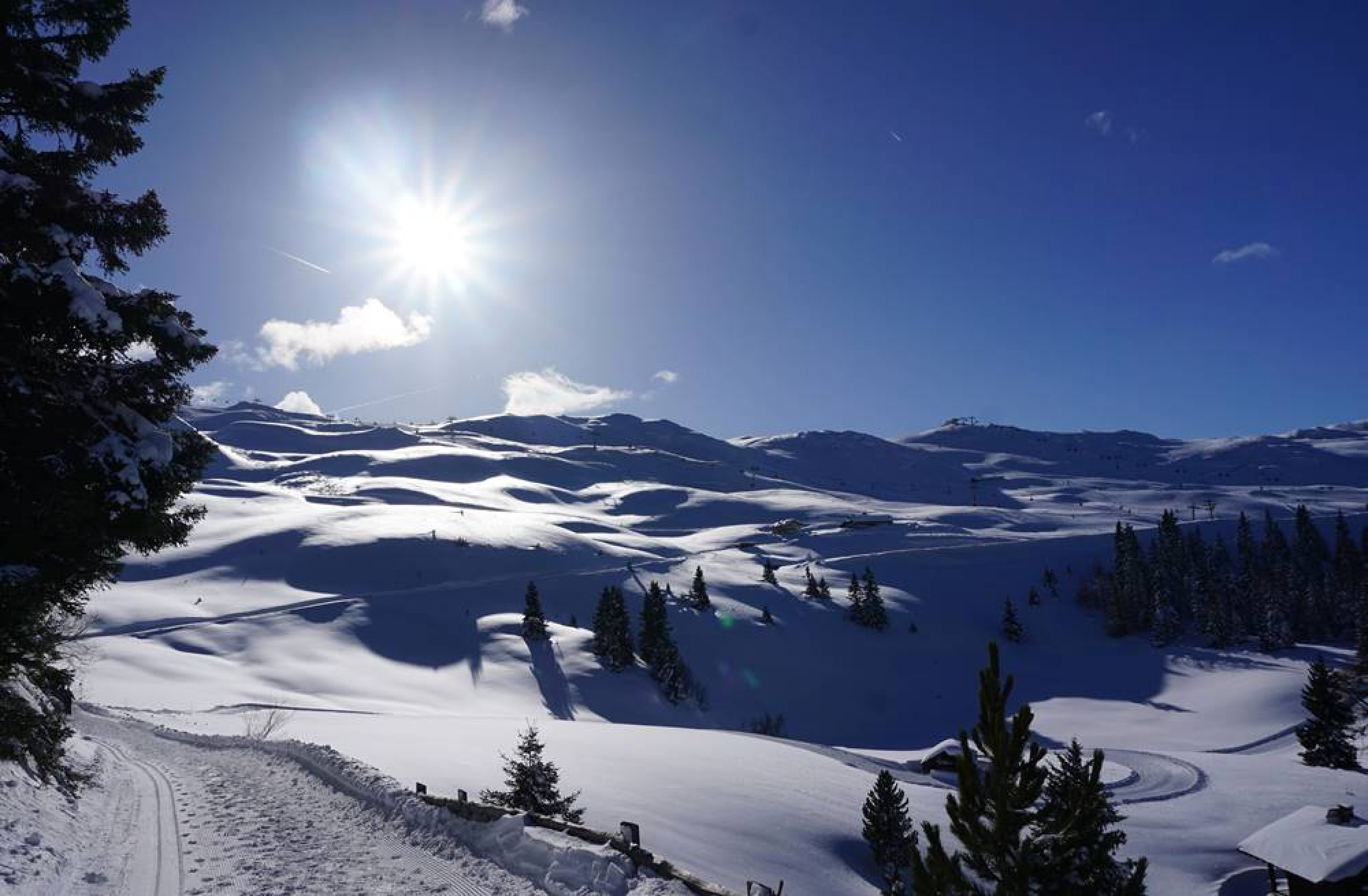 Wir steigen in die Gondel der Seilbahn, die erst 2009 von LEITNER neu gebaut wurde, und fahren hoch zur Bergstation. Wir haben wahnsinniges Glück, das Wetter spielt mit, blauer Himmel, geschlossene Schneedecke, perfektes Kaiserwetter. Wir gehen zum Enzian-Lift und schauen uns diesen neuen 8er Sessellift an, den ersten in ganz Italien, Hightech pur. Direkt neben dem Enzian-Lift entdecken wir Armin’s Waldhütte. Von dieser Hütte haben wir bereits gehört, sie wurde von den Lesern der Tageszeitung “Dolomiten” zur schönsten Skihütte Südtirols 2015 gekürt. Für uns ist aber noch keine Zeit einzukehren, deshalb suchen wir nun den Zugang zum Panoramaweg. Dieser verläuft zusammen mit der Höhenloipe Platschjoch, die 16 km lang ist und heute Morgen schon gespurt wurde. Der Wanderweg ist unberührt und wir haben Vergnügen dabei, die ersten Spuren in den Schnee zu ziehen.