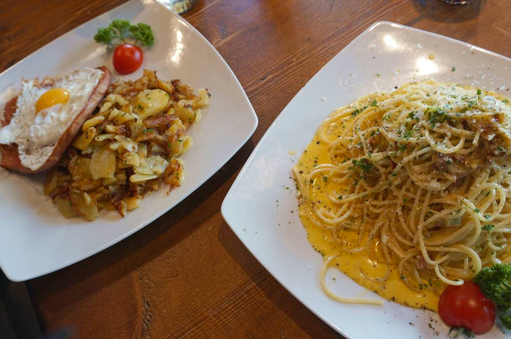 Wir bestellen uns zwei traditionelle Gerichte, einmal Spaghetti Carbonara und einmal gebackenen Fleischkäse mit Bratkartoffeln und Spiegelei. Dazu gibt es ein alkoholfreies Weizen und ein Skiwasser (Himbeersirup mit Mineralwasser). Das Essen kommt schnell und die Portionen sind groß und lecker. Perfekt nach einer Wanderung. Später setzen wir uns noch in die Sonne und genießen das Leben. Wir stellen fest, dass die Kalcheralm ein beliebter Treffpunkt für Familien und Freunde ist. Während die einen wandern und die anderen die Hänge runterbrettern, kann man sich nach den unterschiedlichen Aktivitäten hier zum gemeinsamen Mittagessen in der gemütlichen Hütte treffen.