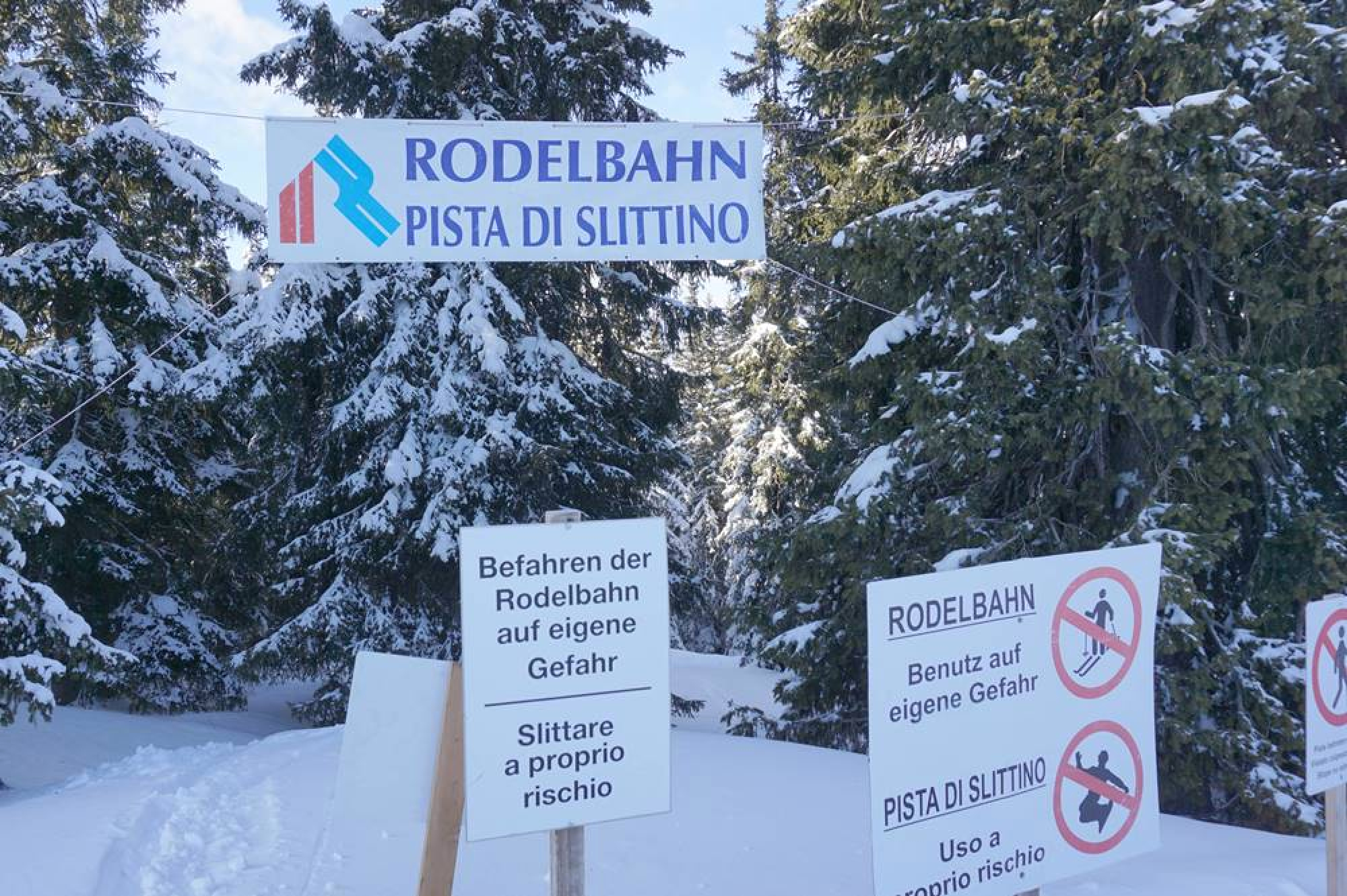 Gut informiert fahren wir zusammen mit "die Rodeln" nochmal hoch zur Bergstation der Ratschings-Jaufen-Bahn. Man kann auch zu Fuß hinauflaufen: Dazu nimmt man den Forstweg und ist etwa zwei Stunden unterwegs. Da es schon so spät ist, nehmen wir die Gondel. Der Einstieg zur mittelschweren Schlittenbahn liegt direkt hinter der Bergstation, sie ist 4,9 km lang, geht bei 1.850 m los und endet an der Talstation auf 549 m..