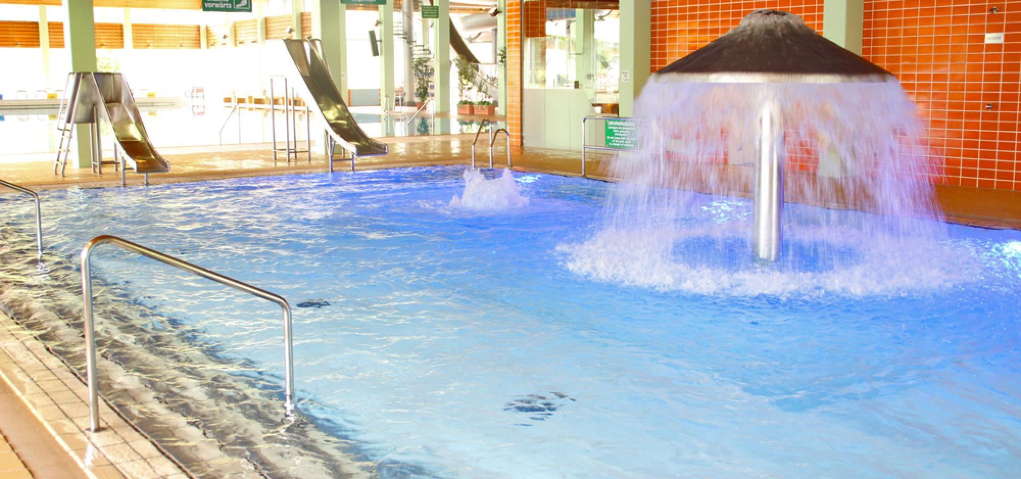 Eine knappe halbe Stunde mit dem Auto ist es von Garmisch-Partenkirchen zum Hallenbad in Ehrwald im benachbarten Österreich. Das Hallenbad hat ein 25 m-Sportbecken mit Gegenstromanlagen und Massagedüsen, ein Solebecken mit Ruheraum. Für die kleinen Gäste gibt es eine Kinderwelt mit Rutsche und Wasserspielgeräten, Wasserklettergerüst und Riesenröhrenrutsche, außerdem gibt es einen Kleinkindbereich mit Planschbecken. Ein Wellnessbereicht mit Saunalandschaft und Solarium sorgt für Entspannung. Jeden Montag und Freitag ist Warmbadetag - dann beträgt die Wassertemperatur 31°C.