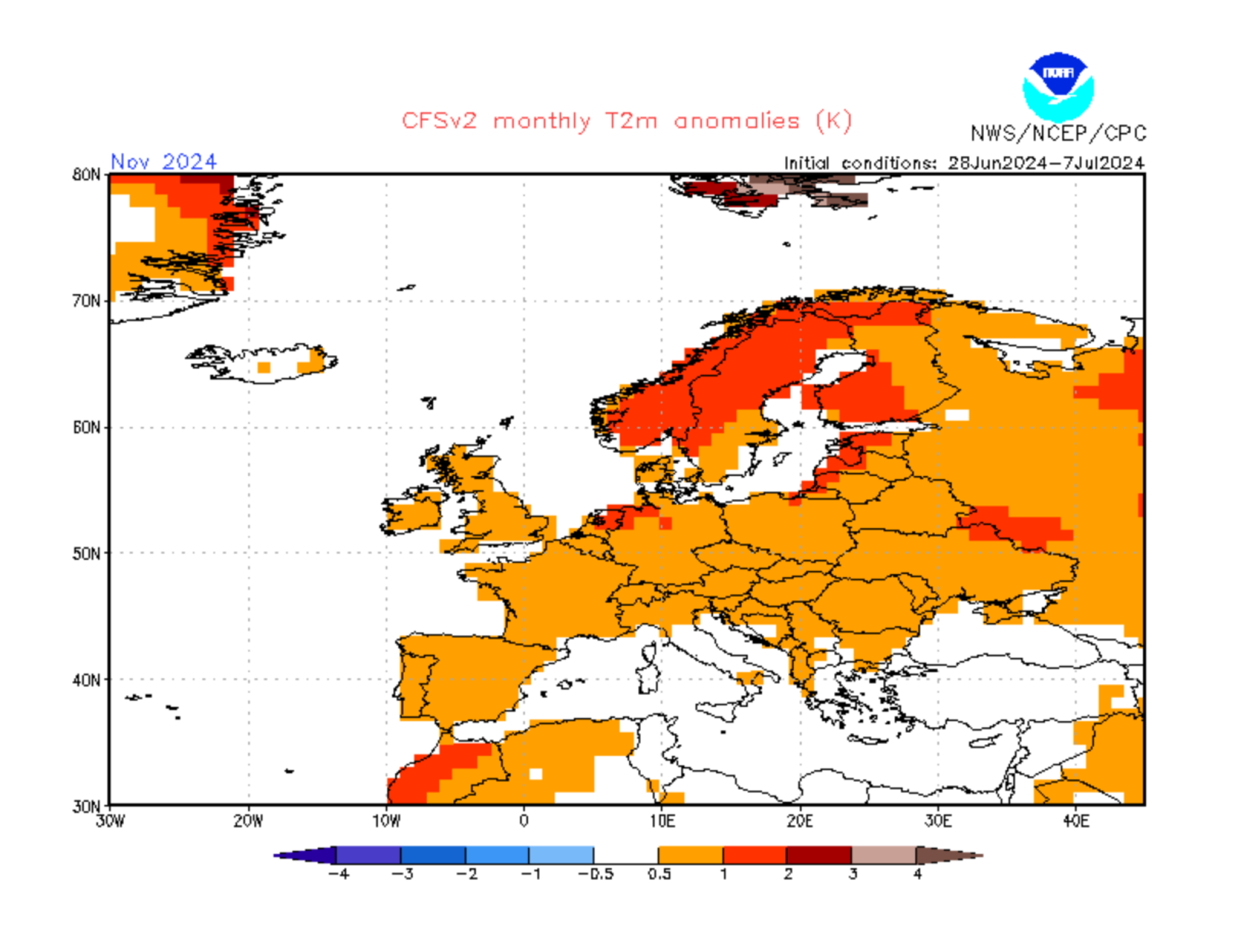 CFSv2 forecast monthly: Temperatur-Abweichung November 2024 (2m) / Stand: 09. Juli 2024 © www.cpc.ncep.noaa.gov