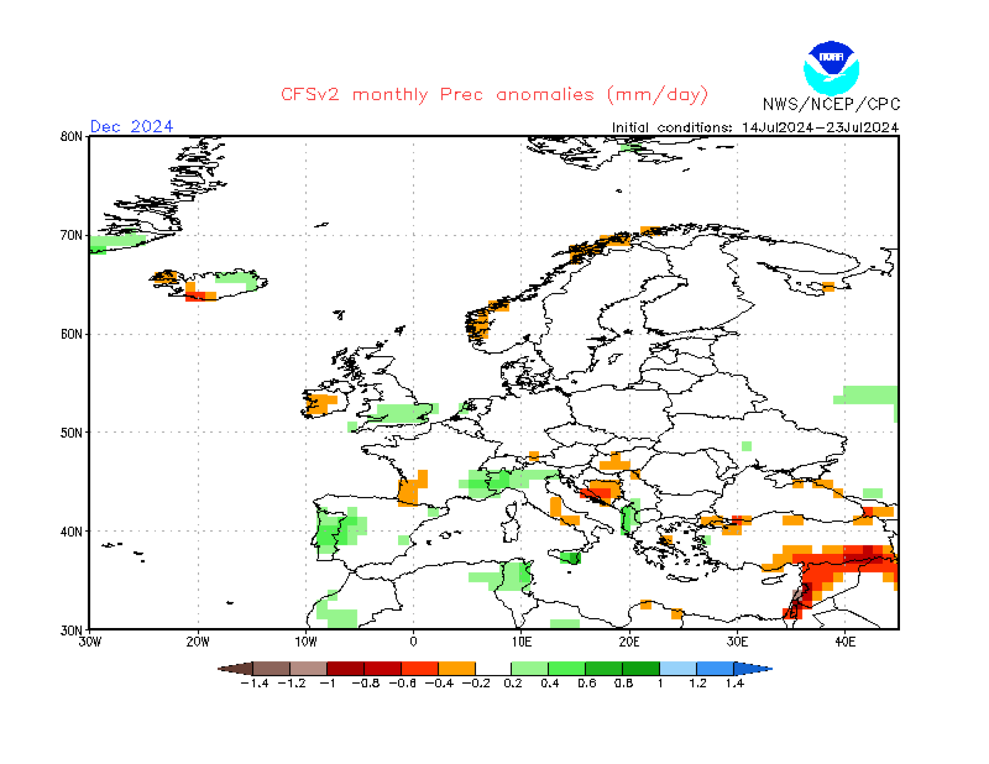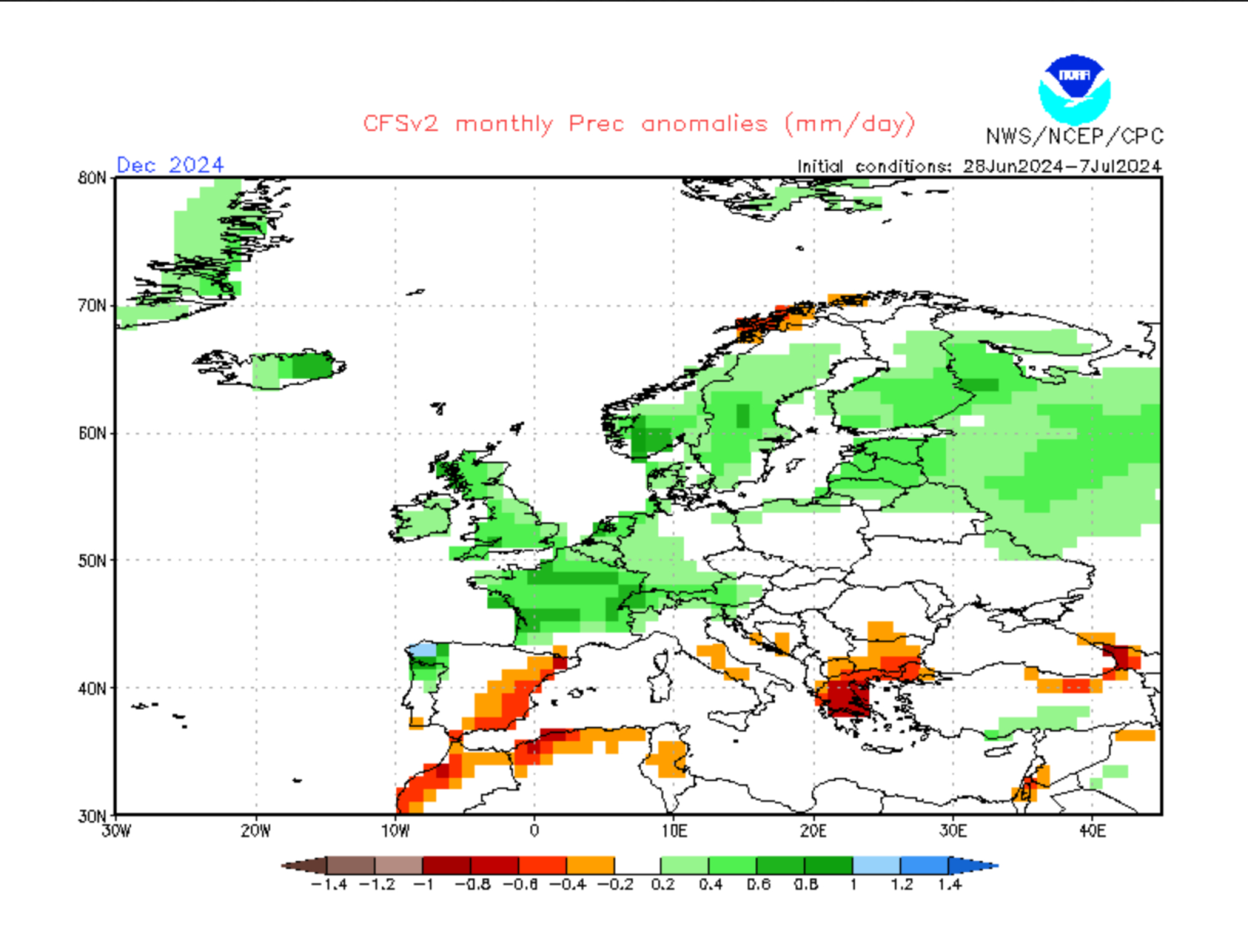 CFSv2 forecast monthly: Niederschlags-Abweichung Dezember 2024 / Stand: 09. Juli 2024 © www.cpc.ncep.noaa.gov