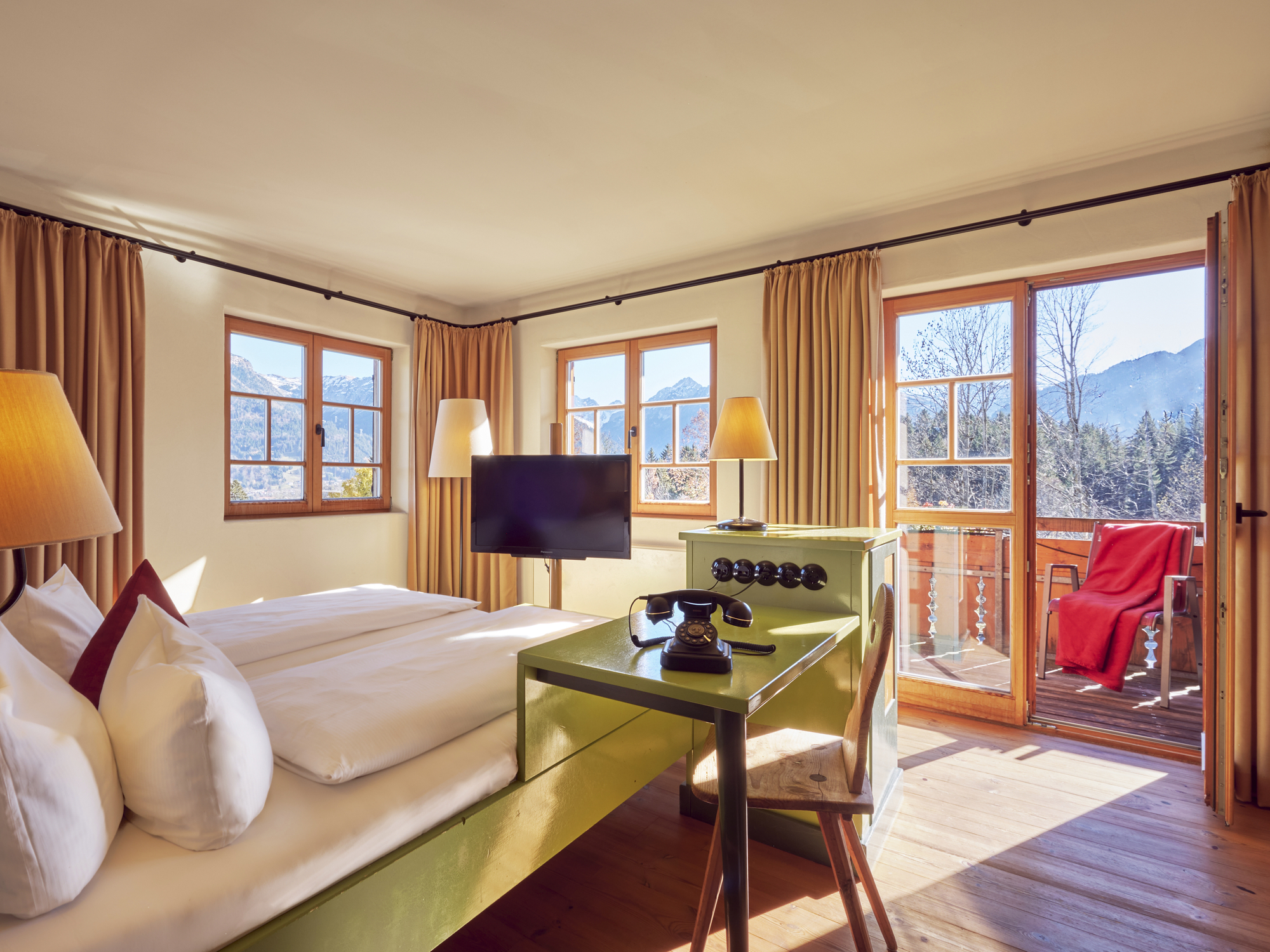 Die großzügigen Doppelzimmer Allgäu Feeling, im ursprünglichen Allgäuer Stil, sind mit viel Holz und Naturstein gestaltet. Die Zimmer verfügen alle über Dusche/WC, Sat-TV, Telefon, gratis WLAN und teilweise Balkon. Angelehnt an die Allgäuer Wohntradition bieten die neuen Allgäu Design-Zimmer sowie die Allgäu Feeling-Zimmer ein besonderes Wohnerlebnis. Mit kleinen antiquarischen Details werden Sie in vergangene Zeiten entführt. Für Familien und Gäste, die noch mehr Raum wünschen bieten die 1-Raum und 2-Raum-Appartements im neuen Allgäu Chalet das ideale Urlaubszuhause. Mit kombiniertem oder getrenntem Wohn- und Schlafzimmer bieten die stilvoll gestalteten Appartements besonders viel Platz. Zur luxuriösen Ausstattung gehören z.B. helle naturgeölte Fichtenholzböden, eine Wand mit Goldpigmenten, hochwertige handgefertigte Design-Möbel sowie mit Allgäuer Kavaliersloden bezogene Polstermöbel und Lederfleckerlteppiche.