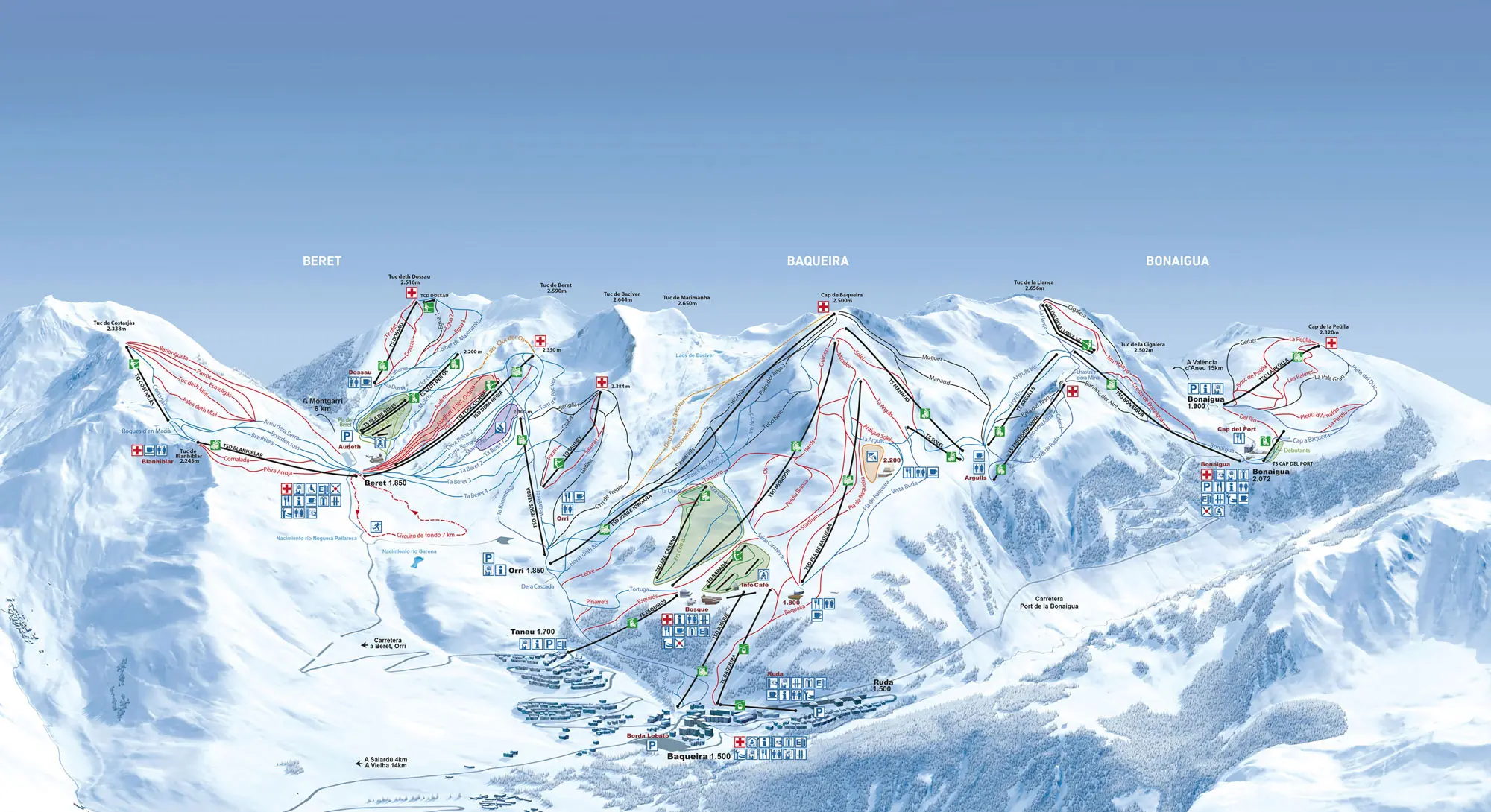 Das Wintersportgebiet besteht aus den drei Talorten Baqueira, Beret und Bonaigua. Anfänger und Familien bevorzugen meist die sanft abfallenden und großzügigen Abfahrtsstrecken von Beret. Cap de Baqueira ist für seine, nach dem Gründer des Skigebiets und einstigen Ski-Profi Luis Arias benannte, rasante Abfahrt bekannt. Auch Bonaiga lockt mit seiner Peülla-Piste sportliche Ski- bzw. Snowboardfahrer an. Alle Strecken in diesem Skigebiet können sich in jeder Beziehung mit denen im Alpenraum messen, jedoch ohne die ärgerlichen Wartezeiten an den Liften. Snowboarder finden ebenfalls hervorragende Pisten mit abwechslungsreichen Obstacles vor. Im herrlichen Pulverschnee in Gipfelnähe sowie im Snowpark kommen auch die wagemutigsten Freerider auf ihre Kosten. Der Snowpark liegt in der Nähe des Blanhiblar-Sessellifts in Beret.