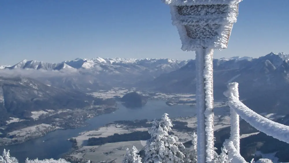 Von der Bergstation der Gondelbahn aus erstreckt sich der Panorama-Rundweg, der Aussichten auf das einzigartige Panorama ermöglicht. Von hier sieht man hinunter zum Wolfgangsee und auf zahlreiche Berggipfel.