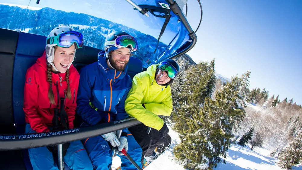 Blick auf das belebte Skigebiet